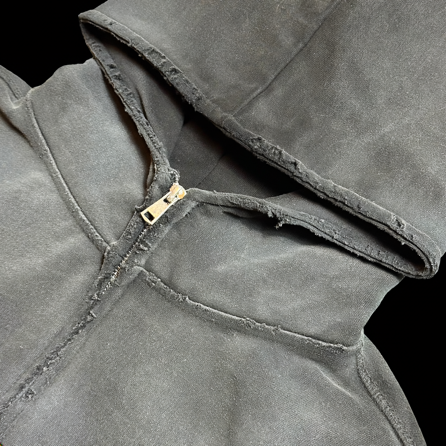 14 Oz. Sunfaded Black Zipped Hoodie made from heavyweight cotton fleece with a relaxed, cropped fit. Features elasticated cuffs and hem, front pockets, distressed details, and tonal faded finish throughout. Finished with a small Endville Studios logo print on the chest.